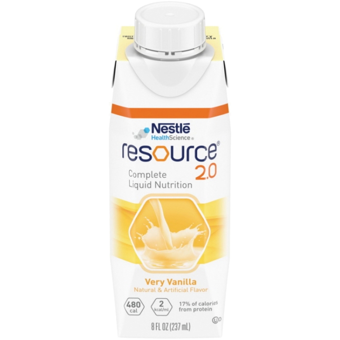 RESOURCE® 2.0 Nutrition, 237 mL Net Content, Ingredients: Water, Glucose Syrup, Canola Oil, Calcium Caseinate (Milk), Sugar and <2% of Sodium Caseinate, Vitamins and Minerals, Cellulose Gel and Gum, Mono- and Diglycerides, Citric Acid, Soy Lecithin, Natural and Artificial Flavor, Salt. Vitamins and Minerals: Potassium Citrate, Magnesium Chloride, Potassium Phosphate, Sodium Ascorbate, Sodium Citrate, Choline Chloride, Magnesium Oxide, Calcium Phosphate, DL-Alpha Tocopheryl Acetate, Ferrous Sulfate, Zinc Sulfate, Niacinamide, Manganese Sulfate, Calcium Pantothenate, Copper Sulfate, Vitamin A Palmitate, Pyridoxine Hydrochloride, Thiamine Mononitrate, Riboflavin, Folic Acid, Potassium Iodide, Sodium Selenate, Chromium Chloride, Sodium Molybdate, Biotin, Vitamin K1, Vitamin D3, Vitamin B12, 237 mL Serving, Number of Servings: 1 Container, HCPCS Code: B4152, Vanilla Flavor, 480 kcal Calories Per Serving